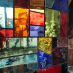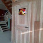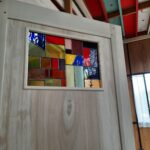 Création d’un petit vitrail moderne en Tiffany de cuivre pour une porte de salle de bain dans une maison à Lavardin.